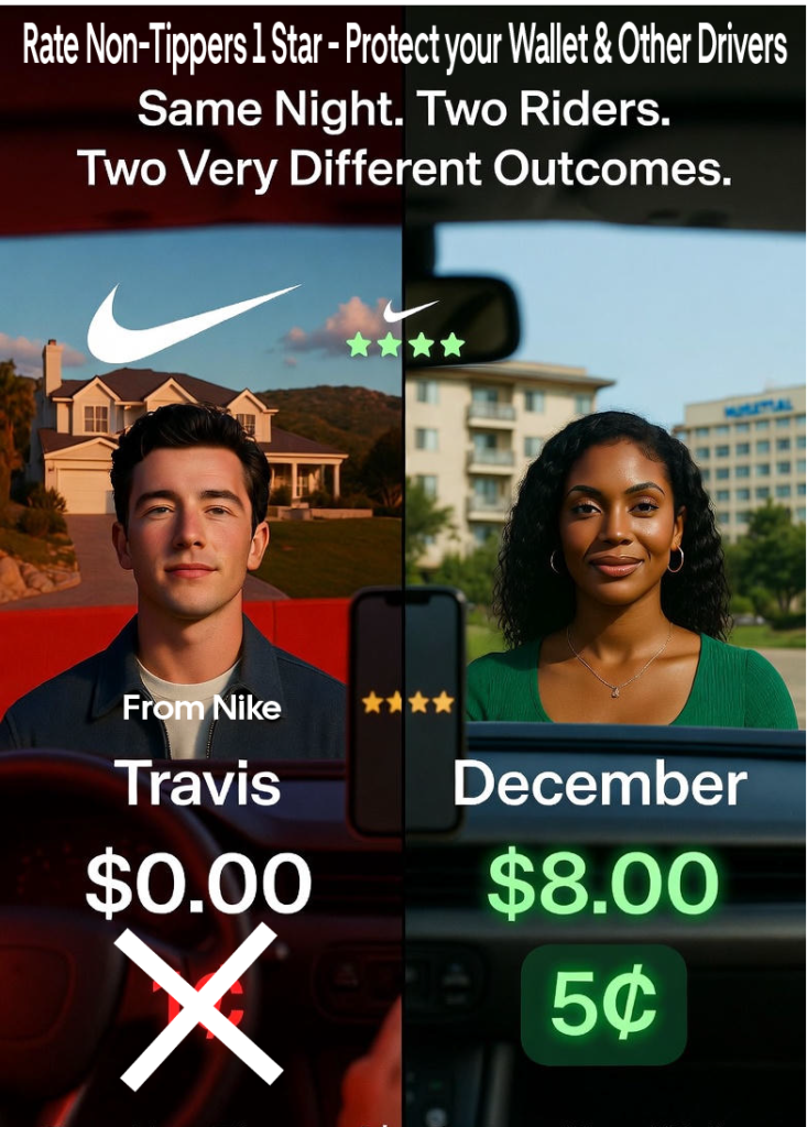 As rideshare drivers, we all know the grind: long hours, unpredictable fares, and the constant hustle to maximize our earnings. But one thing that can make or break our night is the passengers we pick up – especially when it comes to tipping. I’m here to share a real-life story from a recent shift in Portland, Oregon, comparing two very different riders: Travis, the high-rolling Nike exec who didn’t tip a dime, and December, a kind soul from a tough neighborhood who showed real appreciation. This isn’t just venting; it’s a call to action for all of us to start rating non-tippers with 1 star. Not only does it help us avoid being matched with them again, but it also warns fellow drivers about these time-wasters, letting us focus on rides that actually pay off.